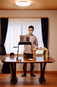 これは休日だったため私服。パソコン用の台と、資料を置くための小机を使ってみた。